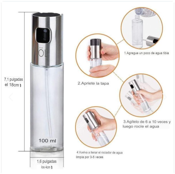 - Fácil de Usar: La acción de bombeo simple produce una niebla fina y uniforme, permitiéndote controlar la cantidad de aceite utilizada en cada ocasión. Una manera eficiente, controlada de aplicar aceite en tus platillos.